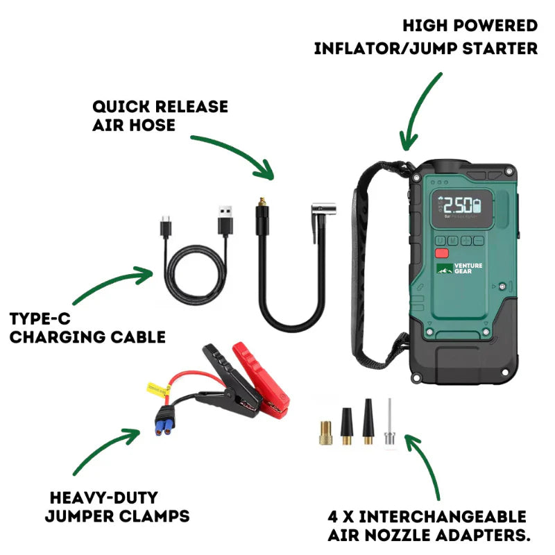 Each box includes the Jump Master Pro jump starter and inflator, durable jumper clamps, a USB-C charging cable, a user manual, and four interchangeable air nozzle attachments.